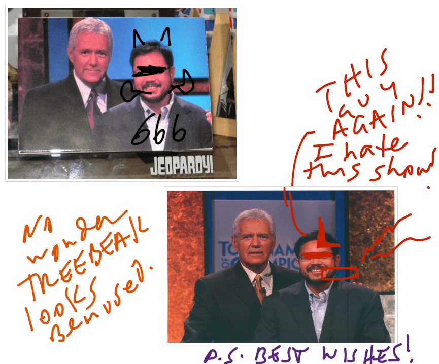 The 30th Anniversary of “America’s Favourite Quiz Programme” Jeopardy! is coming up in 2014. God bless ya, Alex Treebeak! Though we miss your moustache, your kind (read: gentle) sense of humour and fundamental humanity are stronger than ever. We feel your goodness from here, bruddah, even though you are across town over there in Culver City. Hey, it’s OK that you have to shill sometimes for World Vision & Colonial Penn — the rents here in Studio City ain’t second- and third-place-finisher money!